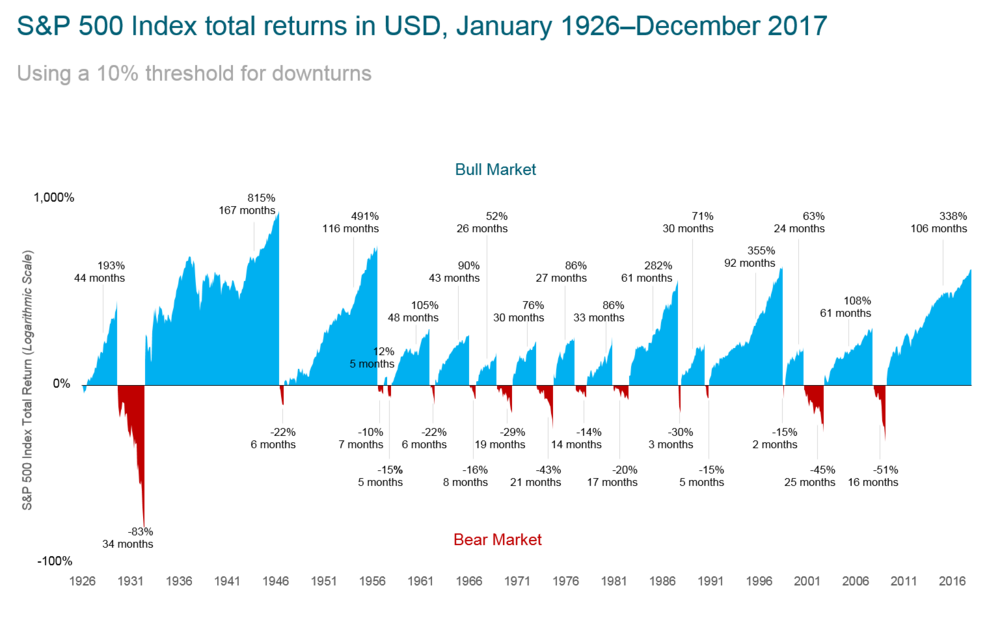 For those who are able to ride the market out, in theory, will benefit in the long run. The graph above shows us that in the last 90 years, the markets have grown more than they have fallen.