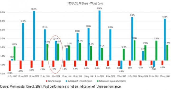From the graph of Morningstar Direct (featured above), we can see the 15 worst days on the JSE (the red bars) since the end of June 1995 and how the local market reacted after the drawdown. The blue bars show the 12-month returns investors experienced after the worst day, and the green bars show the five-year annualised returns after the drawdown.